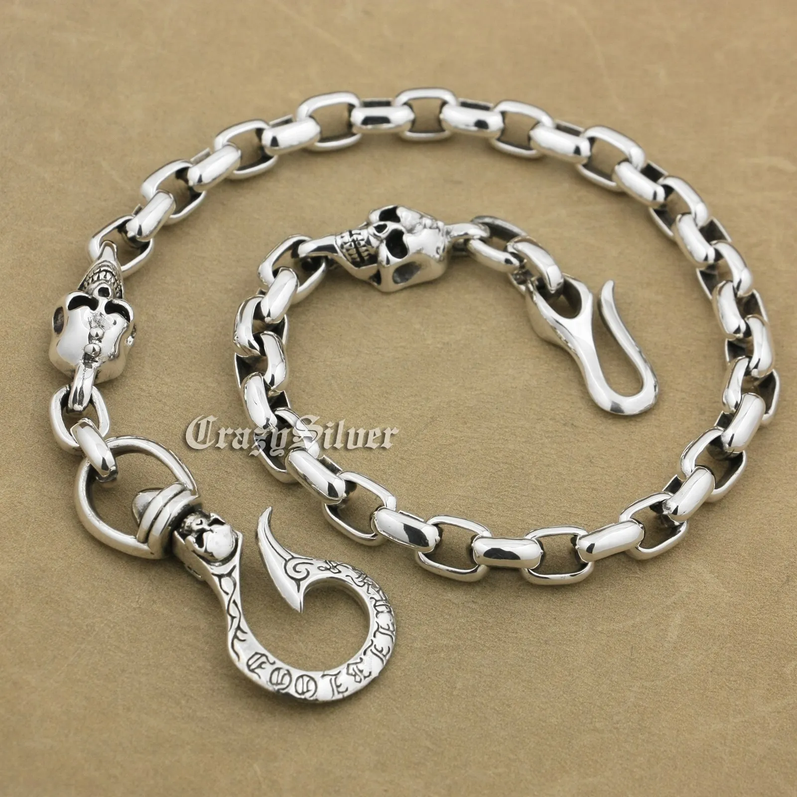 Fish Hook 925 Sterling Silver SKull KeyChain Biker Wallet Chain Punk Accessory 9N014WC